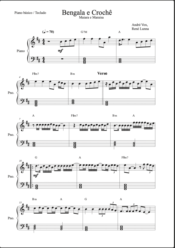 Flauta, Clarinete, Violino, Viola, Trompete, Sax Soprano, Sax Alto, Sax Tenor, Trombone, Cello, Teclado/Piano facilitado (com cifras) e Piano solo (com cifras).